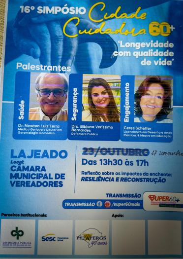 O evento contará com a participação de renomados palestrantes, como o Dr. Newton Luiz Terra, Médico Geriatra e Doutor em Geriatria; a Dra. Bibiana Veríssimo Bernardes, Defensora Pública; e Ceres Scheffer, especialista em Desenho e Artes Plásticas e Mestre em Educação. As palestras abordarão temas como saúde, segurança e engajamento pós-enchente, além de incluir apresentações culturais e atividades de integração motivacional para idosos.