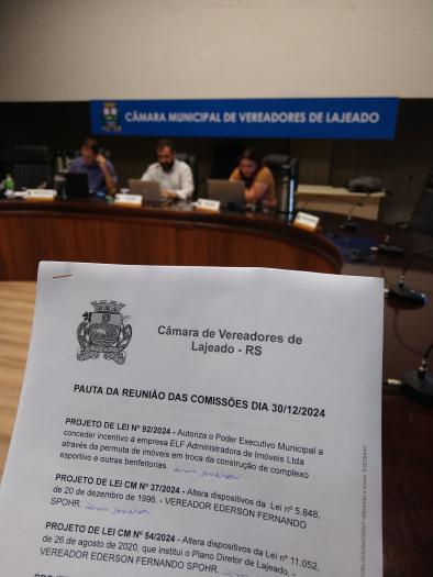 No dia 30 de dezembro de 2024 foi realizada a última Reunião das Comissões Permanentes da Câmara de Vereadores de Lajeado. Estiveram presentes os vereadores Alex Schmitt (PP), Paula Thomas (PSDB) e Heitor Luiz Hoppe (PP), com a participação do assessor jurídico Gustavo Heinen, apresentando pareceres dos projetos em pauta.